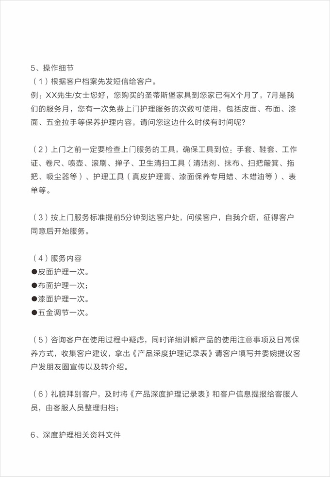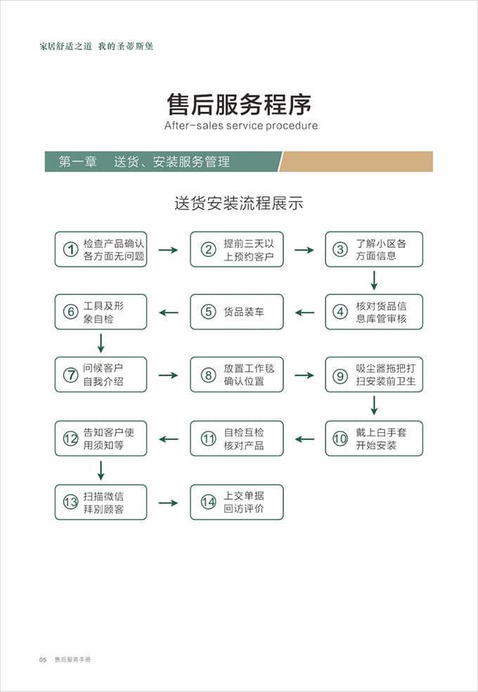 物資準(zhǔn)備:上門前必須著我們統(tǒng)一工作服,佩戴工作證,準(zhǔn)備好安裝工具、搬抬工具(搬運(yùn)背帶等)、備件、筆記本、手套、鞋套、地墊、衛(wèi)生清掃工具(清潔劑、抹布、掃把簸箕、拖把、吸塵器等)、瓶裝水、《我們安裝施工指示牌》、收據(jù)和我們產(chǎn)品說明書、《產(chǎn)品配送單》和《配送滿意度調(diào)查表》等物品。再帶上小禮品,例:鮮花或碳包去味禮包等。