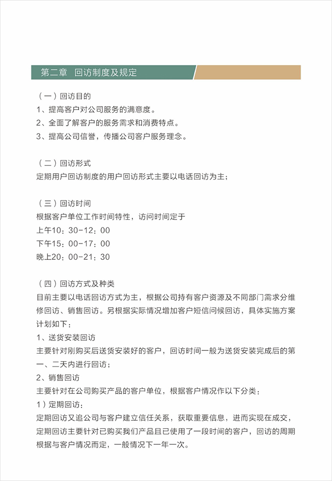 并將有客戶簽名的售后跟蹤單交給店長。店長根據(jù)處理完成結(jié)果登記存檔,并對客戶進(jìn)行回訪,確定售后處理完成,并了解客戶對公司整個(gè)服務(wù)過程的滿意情況。作為對維修處理人員的考核內(nèi)容之一。