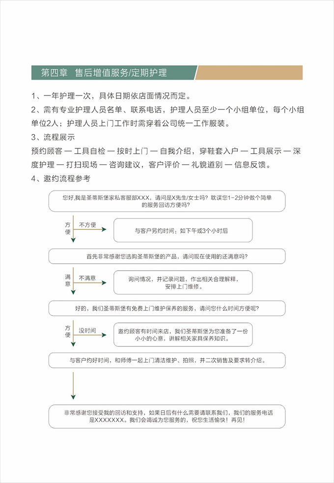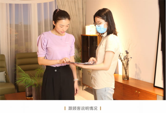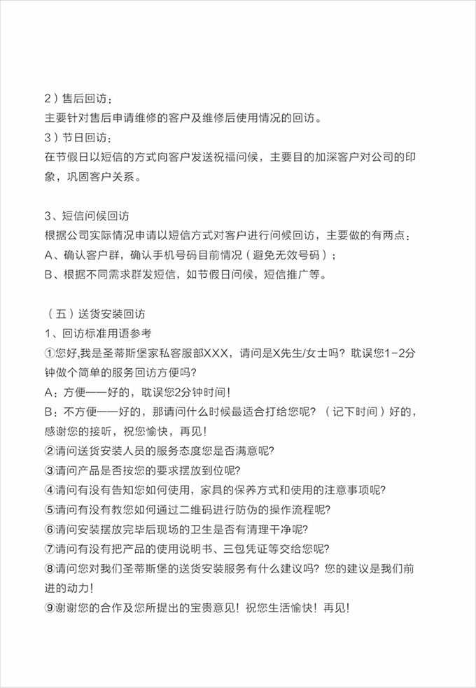話術(shù)參考:“**先生/女士您好,我是我們的售后服務(wù)人員**,您購買的我們家具已經(jīng)全部到貨了,送貨安裝大約需要**時(shí)間,請問您這邊什么時(shí)候方便我們上門送貨安裝呢?”同時(shí)要了解送貨小區(qū)的電梯、樓道、入戶門的尺寸等,提前做好準(zhǔn)備,避免意外情況。最后確定送貨時(shí)間(安裝所需要時(shí)長),并告知客戶安裝人員的相關(guān)信息,可加微信發(fā)送,并發(fā)送配送安裝流程說明。