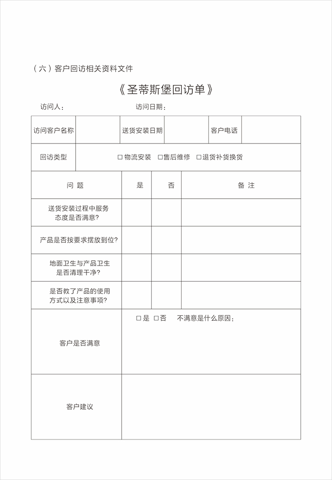 售后人員完成售后,將有客戶簽名的《產(chǎn)品配送單》《配送滿意度調(diào)查表》交給店面經(jīng)理。店面經(jīng)理根據(jù)處理完成結(jié)果登記存檔,并對客戶進(jìn)行回訪,確定送貨安裝服務(wù)完成,并了解客戶對公司整個(gè)服務(wù)過程的滿意情況。
