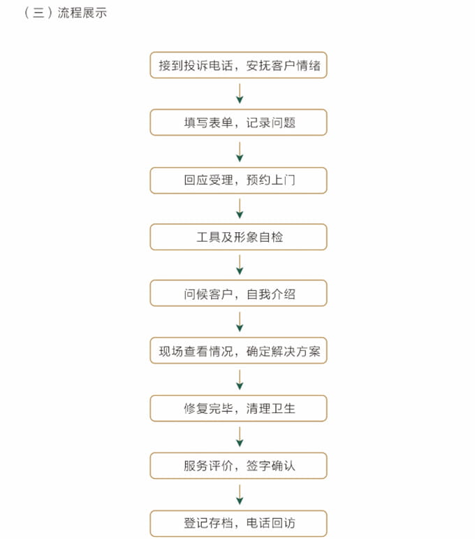 第一時(shí)間把《售后服務(wù)跟蹤單》轉(zhuǎn)交店長。店長在接到《售后服務(wù)跟蹤單》后,在兩個(gè)小時(shí)內(nèi),必須安排專人與顧客進(jìn)行電話聯(lián)系,安撫客戶情緒,回應(yīng)受理此問題,溝通上門維修時(shí)間后,安排維修人員上門處理問題。