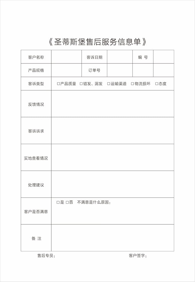 1、導(dǎo)購、店面、售后人員接到維修等售后問題來電時(shí),第一時(shí)間先安撫好客戶情緒,認(rèn)真傾聽客戶的問題描述,并盡量問清存在的問題和故障現(xiàn)象,應(yīng)詳細(xì)記錄顧客名字、聯(lián)系電話、地址、商品型號、問題等信息,將這些信息登記于《售后服務(wù)跟蹤單》上后,再次確認(rèn)客戶問題及訴求,看是否有遺漏,確認(rèn)無誤后回復(fù)客戶多長時(shí)間給他答復(fù);